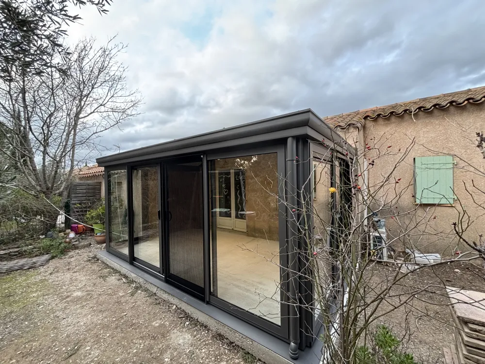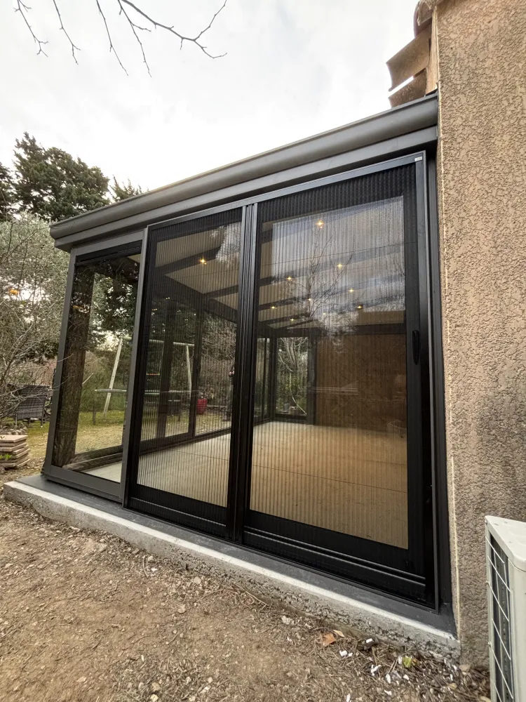 Des moustiquaires discrètes et fonctionnelles ont été installées afin de profiter pleinement de la véranda tout en se protégeant des insectes, sans compromettre la ventilation naturelle.